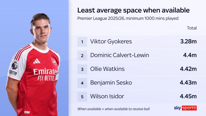在英超球员持球时的平均“可行动空间”排行榜上,约克雷斯以3.28米的数据排名英超最低,远低于其他球员。